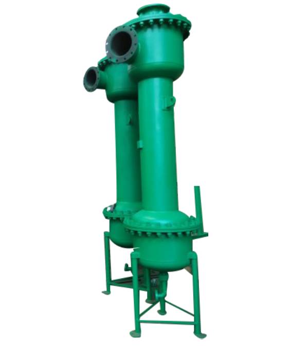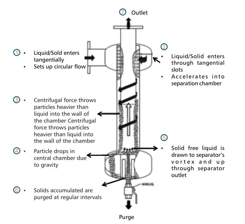 Cyclone Separators (Sand Separators) are used for separation of sand silica like high density particles from water. Minimum operating pressure of 2 kg/cm is required for smooth functioning as these cyclones work on centrifugal motion, for which positive operating pressure is required. Tangential entry is provided at the inlet which allows water to enter in cyclonic motion. Also inside the vessel particular type of slotted pipe is provided which further accelerates the velocity resulting in heavier particles falling at the bottom. Water being of lighter density exit from the outlet at the top. The bottom has a diverter plate with wave breakers in the collection chamber which allows dirt to settle in the chamber. The drain is provided with electrical or pneumatic valve and a small control panel with a timer at bottom.
